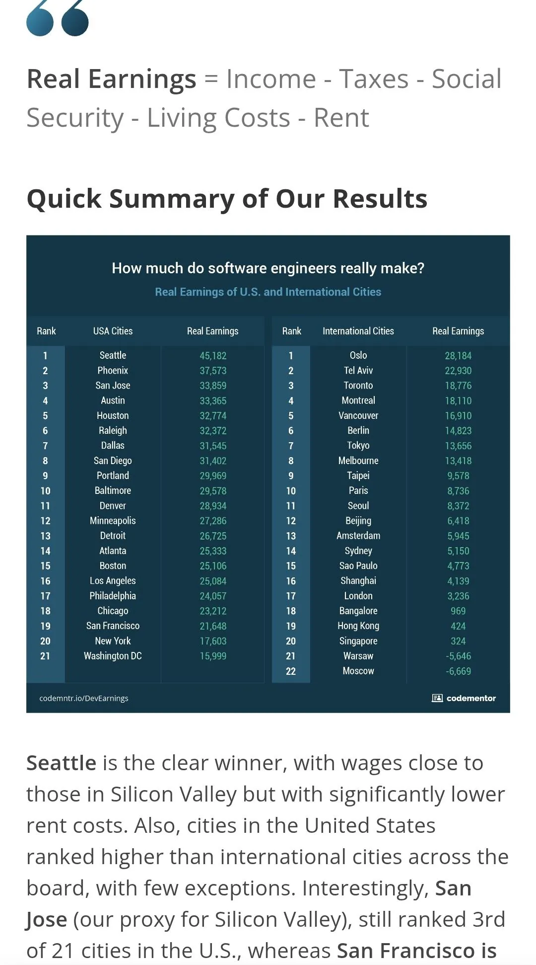실제 소프트웨어 엔지지어들의 실질 소득 도시 순위 보면 단순 세후 가처분소득 순위가 아니라 월세를 비롯한 고정비를 세후 급여에서 빼고 남는 돈 순위임을 볼 수 있고 그래서 미국 실리콘 밸리가 있는 샌프란시스코는 뉴욕과 함께 미국내 최하위권.
