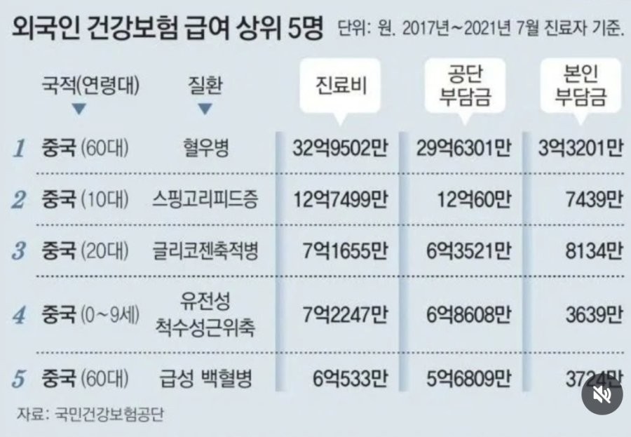 외국인 건강보험 급여 상위 5명 국적 > 유머게시판