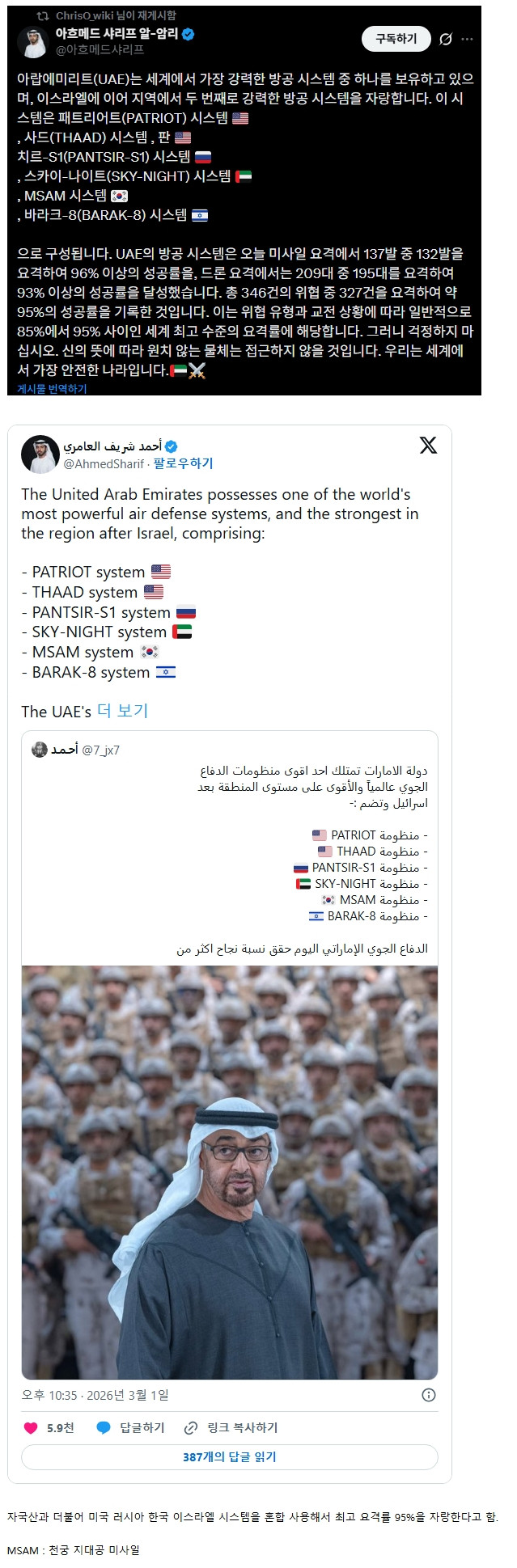 UAE “한국산 포함 방공체계가 이란 공격을 95% 막고 있다” > 유머게시판