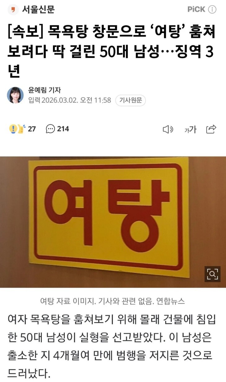 목욕탕 창문으로 ‘여탕’ 훔쳐보려다 걸린 남성