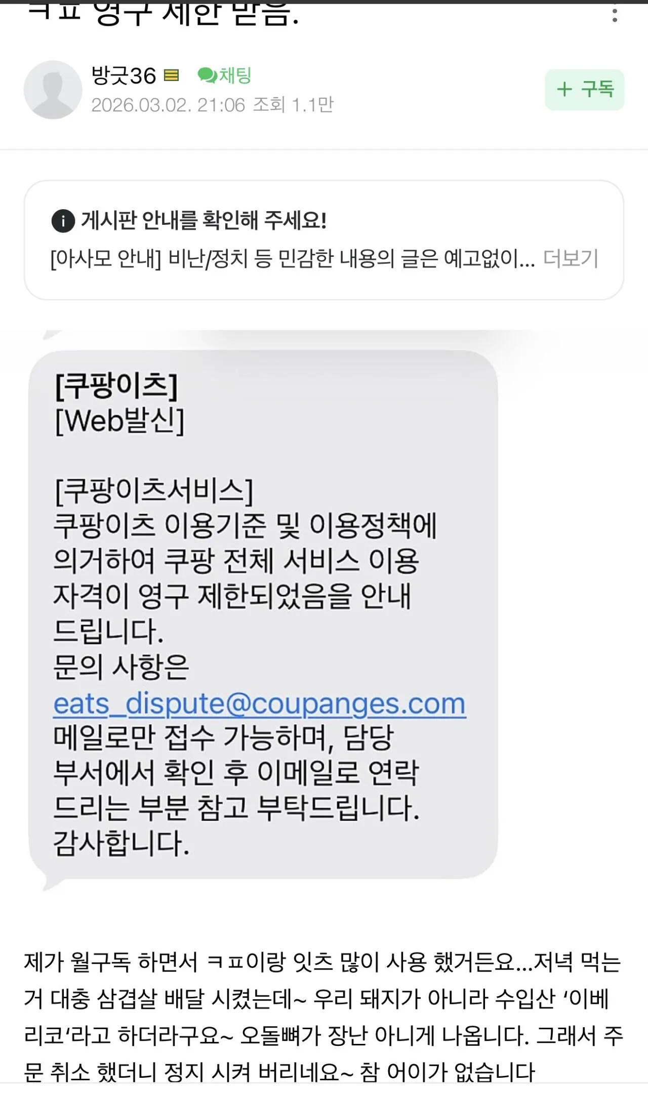 쿠팡이츠 영구정지 받은 이유 ㄷㄷ