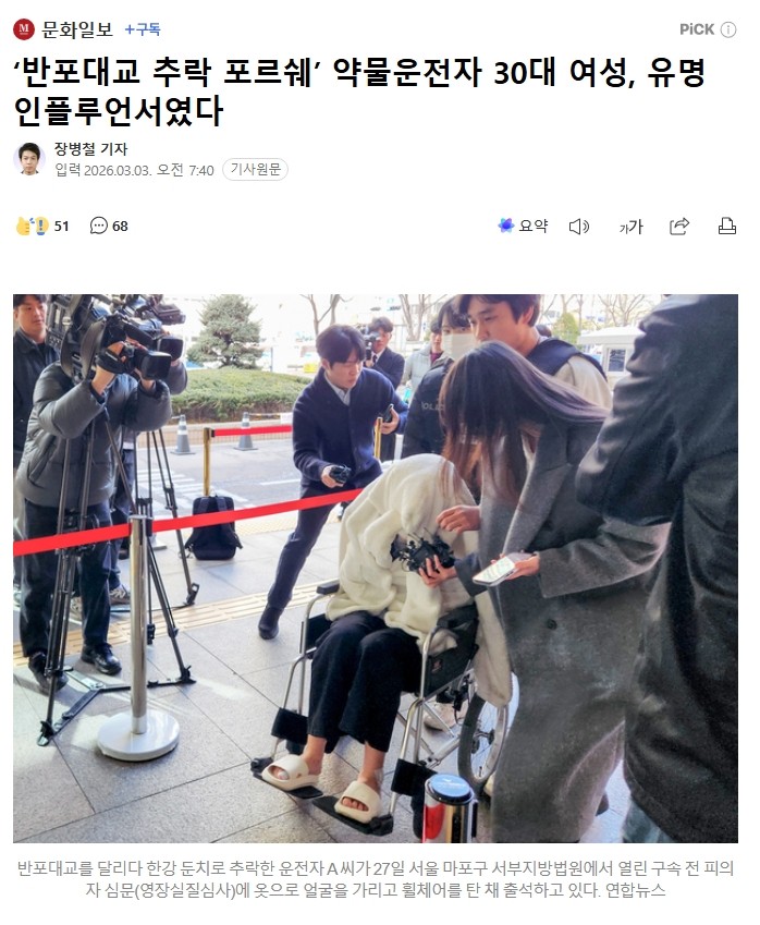 ‘반포대교 추락 포르쉐’ 약물운전자 30대 여성, 유명 인플루언서였다 | 문화일보