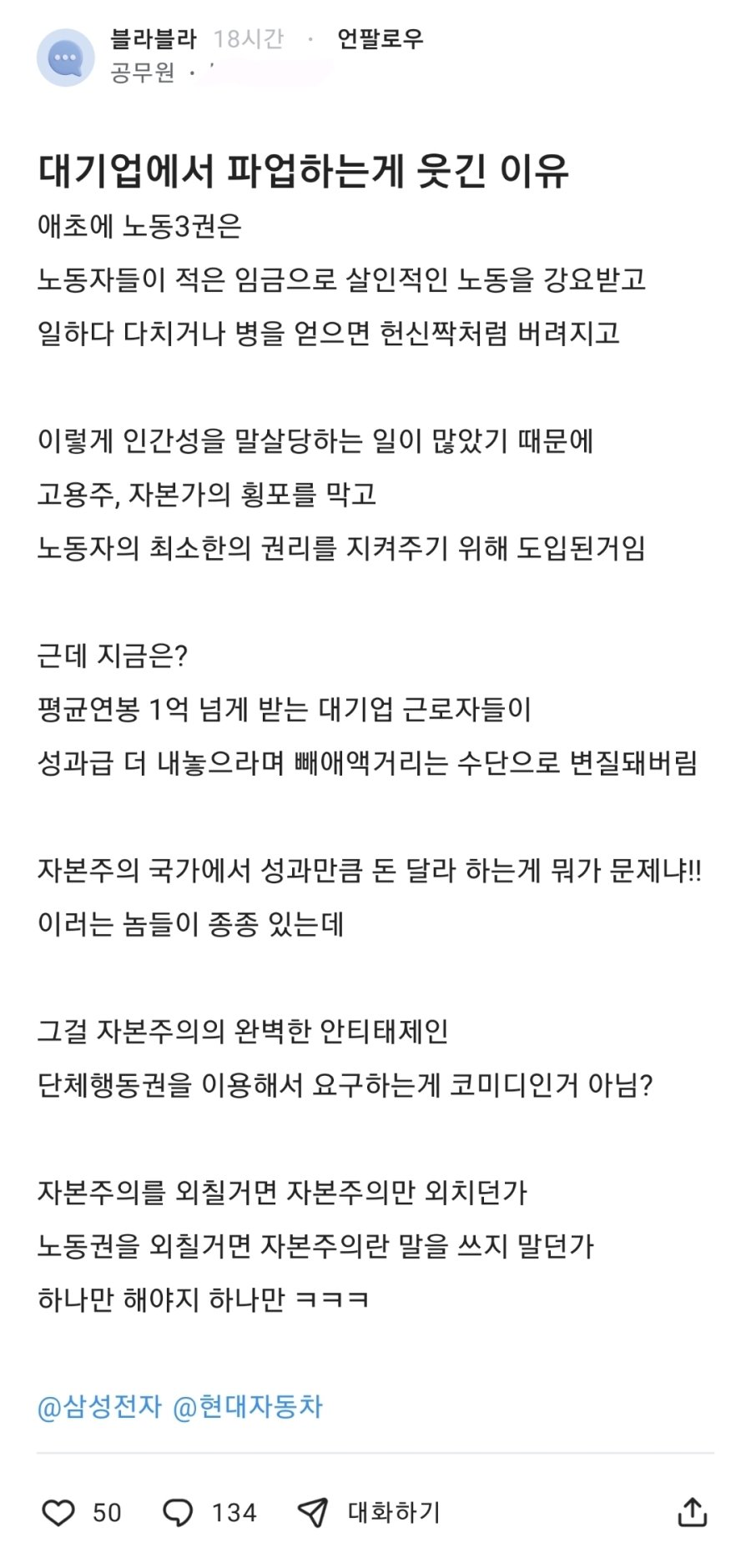 대기업에서 파업하는 게 웃긴 이유
