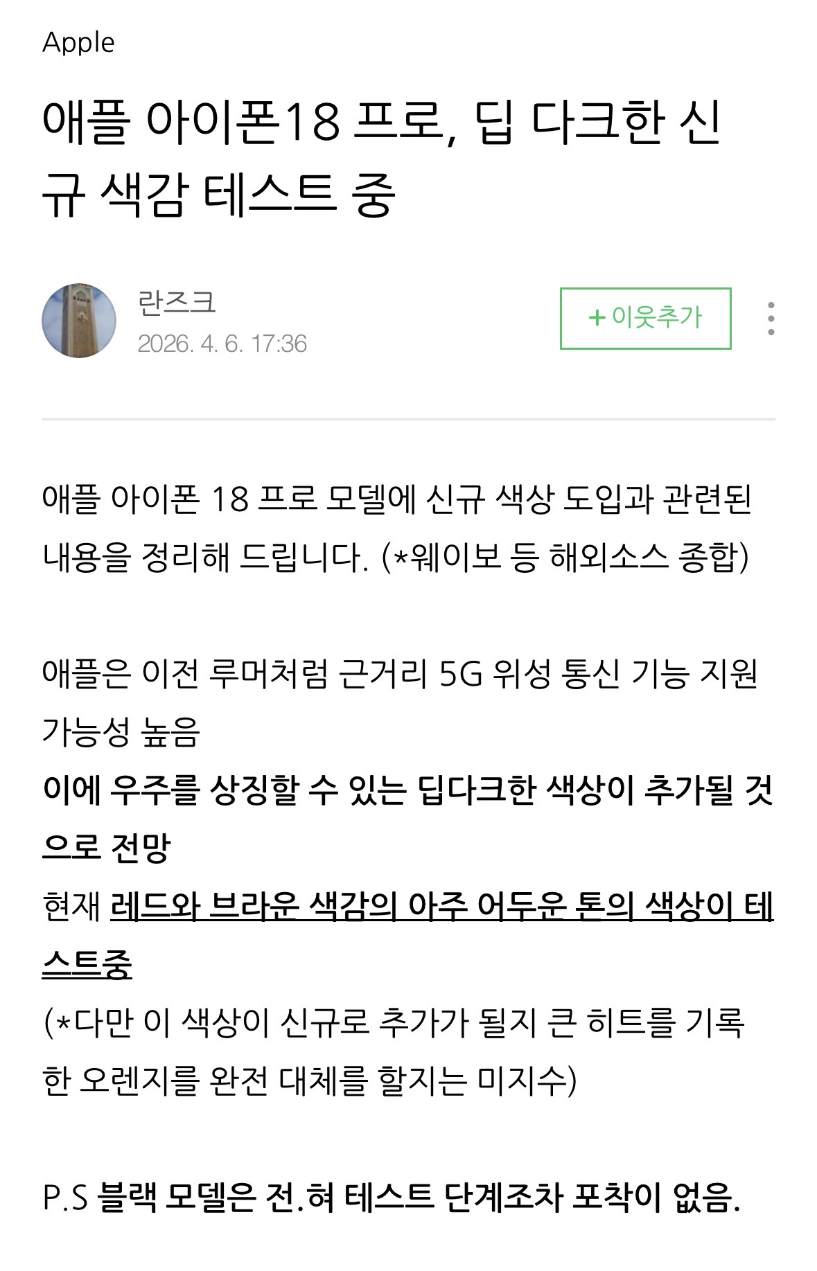 루머) 아이폰 18 프로 시그니처 컬러라고 돌고 있는 짤