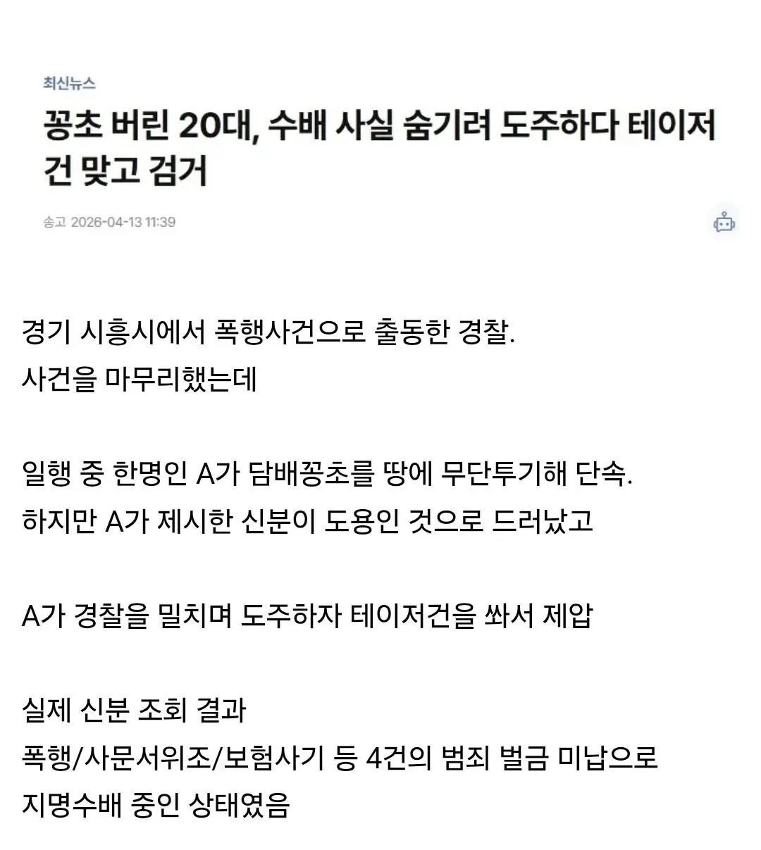 담배꽁초 버렸다가 테이저건 맞은 20대 > 유머게시판